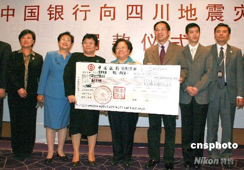5月14日,中國銀行在北京舉行捐贈儀式,向中國紅十字總會捐款1000萬元人民幣,用于汶川地震災區援救工作。中國紅十字總會會長彭佩云代表協會接受捐款。至此,中國銀行集團已向災區捐款近2300萬元人民幣,是目前對此次抗震救災捐款數額最大的企業。中新社發 廖文靜 攝