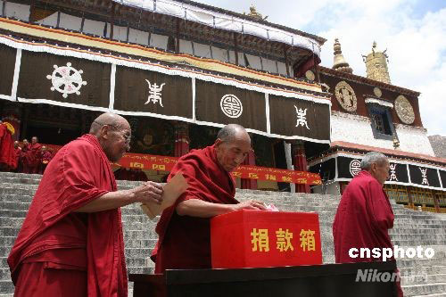 5月14日,在拉薩暴力事件發生兩個月之際,藏傳佛教西藏三大寺廟之一的拉薩哲蚌寺四百多僧人齊聚措欽大殿,將為四川汶川地震災區民眾舉行祈福主題法會,并且,該寺僧眾踴躍為災區捐款,當場募集善款三萬八千余元人民幣。中新社發 柳俊武 攝