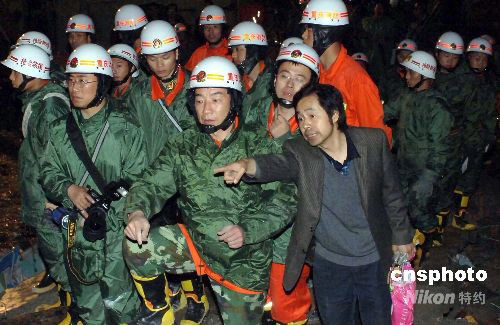四川汶川縣5月12日發生7.8級地震后,北川縣北川中學受到極大的迫害,將近三千名的學生中僅有一半學生生存,另一部分學生因樓房倒塌而遇難或受傷?拐鹣狸爢T不顧艱險連續工作,利用不同工具挖掘被壓人員,并及時成功搶救出一批學員。圖為綿陽一位建筑設計人員輔助施工人員進行搶險救災。中新社發 鄒憲 攝