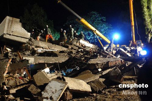 四川汶川縣5月12日發(fā)生7.8級(jí)地震后,北川縣北川中學(xué)受到極大的迫害,將近三千名的學(xué)生中僅有一半學(xué)生生存,另一部分學(xué)生因樓房倒塌而遇難或受傷。抗震消防隊(duì)員不顧艱險(xiǎn)連續(xù)工作,利用不同工具挖掘被壓人員,并及時(shí)成功搶救出一批學(xué)員。中新社發(fā) 鄒憲 攝