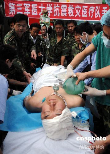 5月15日,解放軍第三軍醫大學“抗震救災醫療隊”在四川地震災區使用野戰手術車對受傷災民進行救治。據了解,這種野戰手術車可同時進行兩臺手術,車體內配有呼吸機、麻醉機、心電監護儀、多功能電切刀和空調等設備,為救治更多的傷員提供了保障。目前,該醫療隊已完成包括16例重癥顱腦損傷在內的各類手術近200例。圖為一名受傷災民成功接受手術后被送出野戰手術車。中新社發 范忠武 攝