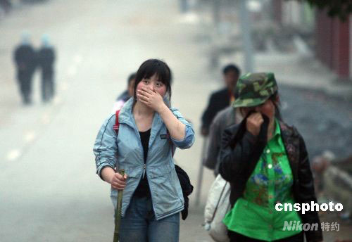 5月15日晚,幾名在距離紅白鎮(zhèn)鎮(zhèn)街幾十公里的西部神奇歡樂谷景區(qū)工作的人員步行逃出山區(qū)。12日發(fā)生的汶川大地震波及四川省德陽市下轄的什邡市(縣級(jí)市)的多個(gè)鄉(xiāng)鎮(zhèn),紅白鎮(zhèn)與外界交通、通訊被完全阻斷。15日下午16時(shí)許,外界到紅白鎮(zhèn)鎮(zhèn)街的道路被打通。中新社發(fā) 郭晉嘉 攝