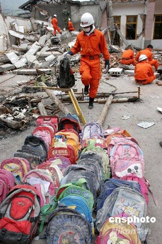 5月15日,在四川省什邡市紅白鎮(zhèn)中心小學(xué)廢墟旁,河南省消防總隊(duì)抗震救災(zāi)突擊隊(duì)的搜救人員將找到的孩子們的書(shū)包整齊排放,等待家長(zhǎng)認(rèn)領(lǐng),以告慰生者。五顏六色的小書(shū)包仿佛一個(gè)個(gè)鮮活的幼小生命立于記者的眼前。 中新社發(fā) 張曉理 攝