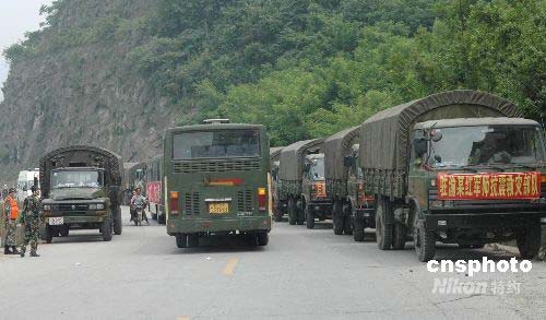 遵照中央軍委主席胡錦濤的命令,5月16日,解放軍部隊官兵繼續前往四川汶川“5.12”大地震各重災區搶險救災。圖為濟南部隊、駐渝某紅軍師等車隊。中新社發 肖龍聯 攝