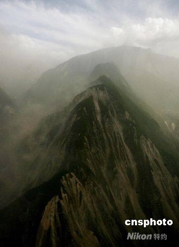 四川省五月十二日突發汶川大地震至今已是第四天,空中鳥瞰群山瘡痍滿目,余震中煙塵滾滾。中新社發 賈國榮 攝