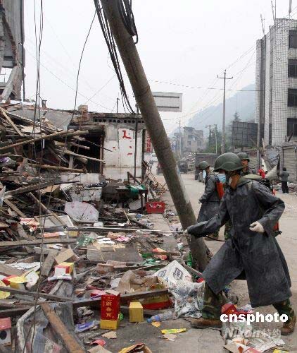 5月17日,一名解放軍正給清理后的廢墟消毒。四川地震重災區德陽市下轄什邡市(縣級市)紅白鎮已開始消毒防疫。中新社發 郭晉嘉 攝