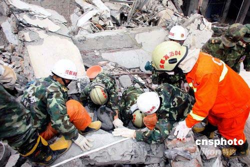 5月16日,武警成都消防支隊在廢墟中連續奮戰12個小時,搜尋生存者。中新社發 張雷 攝