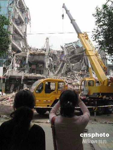 5月16日,抗震救災人員在四川都江堰市一邊搜死者,一邊拆除建筑廢墟。5月12日中國汶川大地震,四川都江堰市內絕大部分建筑出現致命性破壞,造成許多人員傷亡,大部分建筑失去使用價值。中新社發 鄒憲 攝
