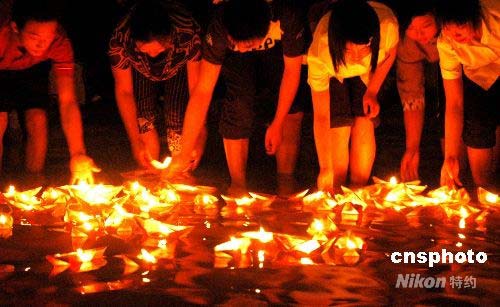 5月16日晚,安徽省蕪湖市辣子村36位四川籍員工將親手折疊的祈福船放入長江漂流,借燭光寄托思念,以漂船渡平安的表達方式,祈求家鄉受災的親友戰勝災魔。中新社發 陳立希 攝