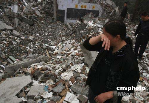 五月十七日,一位哭腫雙眼的母親徘徊在汶川大地震中垮塌的灌縣聚源中學廢墟上,在她失蹤的十四歲兒子上課位置尋找課本書包沒有結果,淚流不停。中新社發 賈國榮 攝