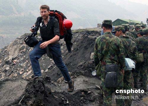 一名美國《紐約時報》的攝影記者,5月17日晚通過解放軍工兵部隊剛剛打通的由都江堰至四川省汶川大地震核心重災區映秀鎮的簡易公路進入映秀鎮采訪。四川省汶川地區發生大地震,引起國際媒體的高度關注,災區內經?梢钥吹酵鈬浾叩纳碛。中新社發 任晨鳴 攝