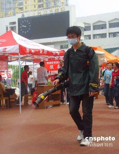5月17日,志愿者正在綿陽南河體育中心地震災民安置點噴灑消毒液殺菌,以防發生疾病傳染。中新社發 霍潺 攝