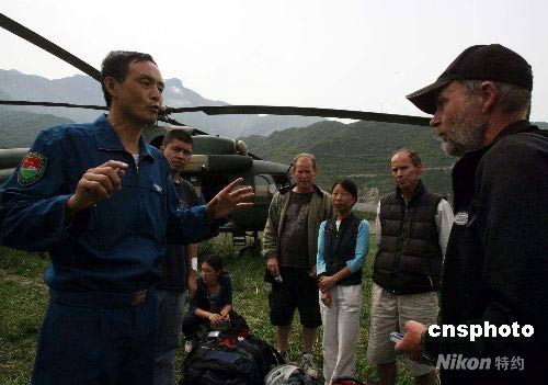 五月十八日,三名美國游客和三名澳大利亞游客以及一名丹麥游客從茂縣登上救援的成都軍區陸軍航空兵某團的直升飛機,搭乘王牌飛行員姜機長的飛機撤回“天府之國”四川省會成都。這批來九寨溝的游客被困在地震災區己經七天,之前先通過軍方的海事衛星電話,分別向海外親人報告了平安。 中新社發 賈國榮 攝