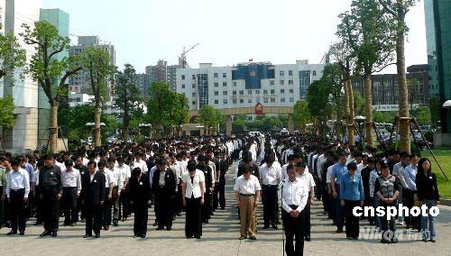 5月19日, 揚州市委、市人大、市政府、市政協,各區委、區政府及市直有關部門下半旗,沉痛哀悼四川地震遇難同胞。14時28分起,全市人民默哀3分鐘,汽車、火車、船舶鳴笛,各防空警報點防空警報鳴響。在全國哀悼日期間,停止公共娛樂活動,開展一系列的哀悼活動,以表哀思。截至18日晚,揚州市募集賑災捐款突破千萬元人民幣。圖為揚州市政府大院全體工作人員胸佩白花集體列隊默哀。中新社發 崔佳明 攝