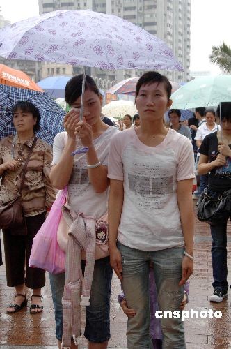 5月19日14時28分,在廣州上下九步行街上的市民在雨中默哀3分鐘,表達(dá)對四川汶川大地震遇難同胞的深切哀悼。中新社發(fā) 梁永強(qiáng) 攝
