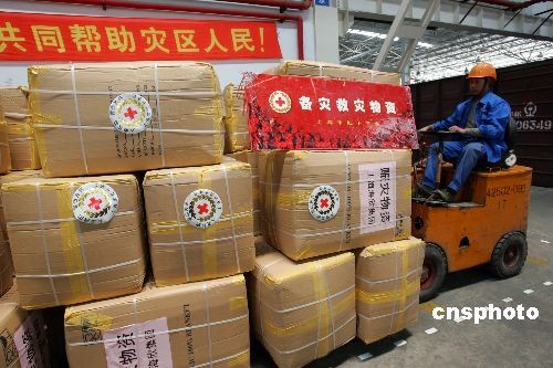 5月20日,又一批醫療器材、藥品在上海市長韓正的指揮下,從上海緊急運往四川災區。截止到19日,上海連續緊急調集并運往災區抗震救援物資達1127噸,價值2954.43萬元。圖為工人在加緊搬運救災物資。