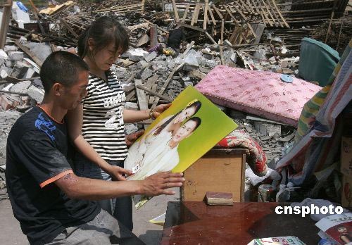 5月19日,四川省什邡市鎣華鎮仁和村三組梁正彬一家正在從廢墟中扒尋自家物品。他們很幸運,災難發生時,包括老父母和年幼女兒在內的全家5口人都跑出了轟然倒塌的房屋。“平安就是福!”他們默默收拾殘屋,準備重建家園。中新社發 張曉理 攝