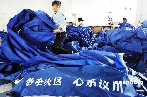 5月20日,浙江杭州一雨具制品廠的女工們在日夜趕制災區急需的救災專用帳篷。據了解, 該廠急災區所急,放棄其他雨具生產,每天開足馬力生產帳篷,產量達300頂,比平時增加一倍,并實行微利銷售。目前已有2000多頂救災專用帳篷送往四川、陜西等地震重災區。