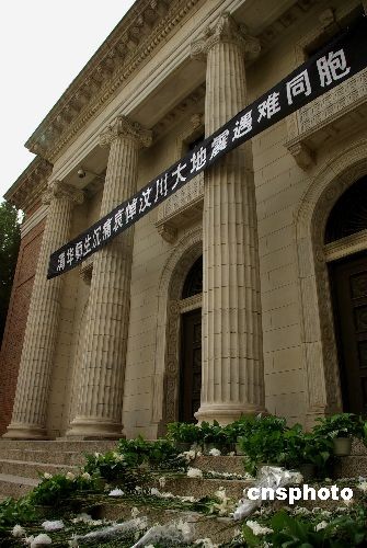 5月20日,清華大學大禮堂上方懸掛著黑底白字條幅:清華師生沉痛哀悼汶川大地震遇難同胞。全國哀悼日中,清華大學師生以各種方式表達對于遇難同胞的哀悼,以及對地震災區(qū)同胞的關懷和支持。