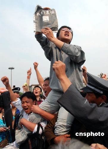 5月19日,全國哀悼日,民眾在北京天安門廣場揮舞著國旗,為四川加油,希望受災(zāi)民眾早日度過難關(guān)。中新社發(fā) 李京生 攝