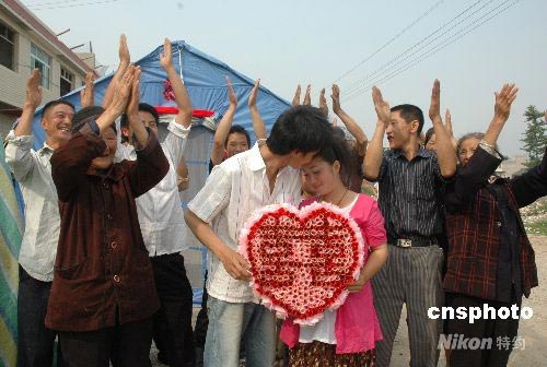 5月22日,在汶川大地震重災區——四川安縣黃土鎮馬村境內的臨時災民救助點里,新郎肖建平與新娘熊招鄰舉行了帳篷婚禮。災難會帶給人們創傷,但是無法磨滅人們對美好生活的向往。中新社發 涂萍 攝