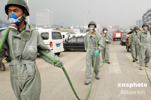 空軍某部綿竹漢旺街頭展開消毒防疫