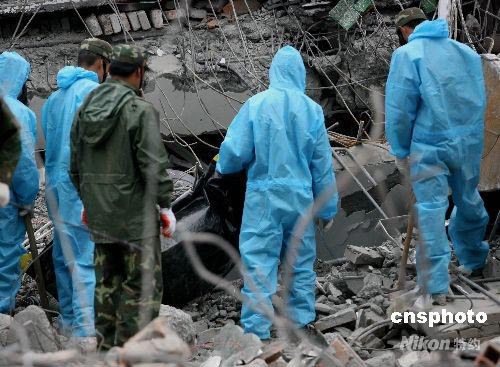 武警官兵五月中旬開始清理汶川大地震受災(zāi)嚴重的映秀鎮(zhèn),他們在漩口中學(xué)每一次挖掘出來遇難學(xué)生的遺體時,都沉痛默哀。中新社發(fā) 賈國榮 攝