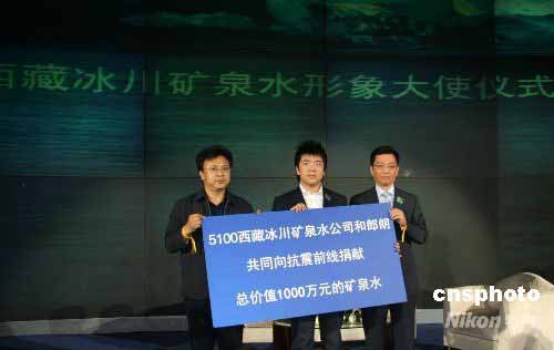 5月25日,5100西藏冰川礦泉水與其形象代言人郎朗聯名,通過中國紅十字會,共同為四川地震災區捐助總價值一千萬元的礦泉水。由于地震災區供水設施毀壞嚴重,清潔的飲用水成為災區最緊缺的用品之一。早在5月12日大地震當天,5100已迅速將數車礦泉水送往抗災前線。中新社發 魏晞 攝