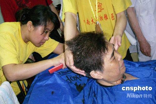 5月27日,湖南青年志愿者為住在湘雅二醫院的四川震區傷員理發。目前,湖南已接收四川地震災區傷員507名。中新社發 劉雙雙 攝