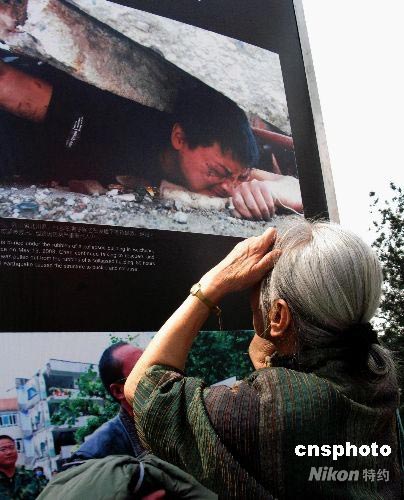 5月31日,北京王府井新華書店前,一名老人仔細(xì)觀看百名攝影家抗震救災(zāi)攝影展,一名四川省北川羌族自治縣的男子被壓在廢墟下等待救援的圖片,深深震撼了老人。此圖片是新京報記者郭鐵流5月15日在四川北川拍攝的。中新社發(fā) 鄒憲 攝