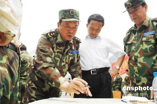 成都軍區(qū)司令員李世明中將6月2日在災(zāi)區(qū)映秀組織指揮軍地人員搜尋失事直升機(jī)。中新社發(fā) 陳文 攝