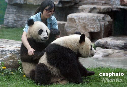 6月2日,一對雌雄“奧運大熊貓寶寶”在北京動物園新家依偎在一直照料它們的臥龍女飼養員身邊玩耍。5月24日從四川地震災區運抵北京的八只臥龍“奧運大熊貓寶寶”,經過多日的精心照料已基本從大地震的陰影中解脫出來。從6月5日開始,公眾可以在這里盡情觀賞它們的風采。 中新社發 任晨鳴 攝