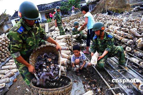 六月三日,空降兵士兵在四川什邡幫助百姓搶收木耳。四川什邡是重要的木耳生產(chǎn)基地,地震中損失慘重。五月十二日發(fā)生地震后八小時(shí)即空降至該地的空降兵部隊(duì),目前正開展幫助民眾重建家園工作,兩天內(nèi)他們已幫助農(nóng)民搶收木耳九千多公斤,以盡力減少地震帶來的經(jīng)濟(jì)損失。中新社發(fā) 慎重 攝