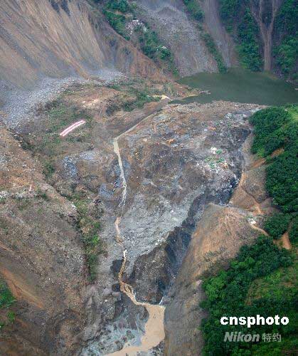 6月7日8點12分,唐家山堰塞湖開始泄流,湖水通過泄流槽流出。20分鐘后,泄流水頭到達湔江河床。圖為空中俯拍的唐家山堰塞湖泄流情景。中新社發 楊衛華 攝