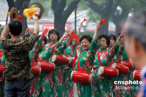 6月14日是中國第三個文化遺產(chǎn)日,整治一新的國子監(jiān)街喜迎開街。國子監(jiān)街因孔廟國子監(jiān)在此而得名,距今已有700多年的歷史,是北京市唯一一條被列入市級文物保護(hù)單位的街道,也是北京保留下來的唯一一條牌樓街。圖為傳統(tǒng)腰鼓舞喜迎開街。中新社發(fā) 魏瑋 攝