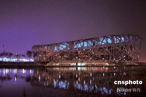 奧運離中國國人越來越近,6月下旬,奧運主要場館——“鳥巢”因加緊調試燈光系統而停止外部的照明,但加緊開幕式排演的燈光卻要亮到深夜。 中新社發 楊佐桓 攝