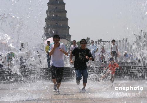 6月28日,西安當日氣溫高達37攝氏度,市民們歡快地在大雁塔噴泉廣場上戲水降溫。中新社發(fā) 尤中原 攝