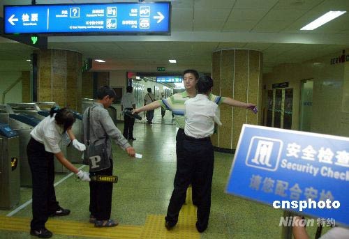 6月29日,安撿人員對北京乘坐軌道交通的旅客進行安全檢查。為維護北京地鐵的公共秩序,保障奧運會的順利舉行,當日起至9月20日,北京對乘坐軌道交通的旅客所攜帶的物品實施安全檢查。檢查的重點將放在對攜帶槍支彈藥、管制刀具、易燃易爆及放射性、毒害性等可能影響公共安全的物品進行檢查。中新社發 富田 攝