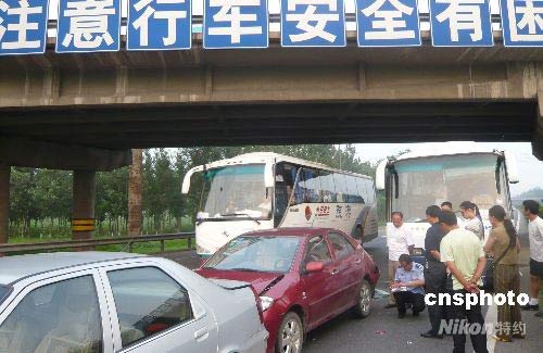 京津高速安全行駛標語下的車禍。7月18日18點,在天津通往北京的高速公路上,3輛轎車、1輛大巴車、1輛滿載乘客的機場大巴車追尾相撞,事故無人傷亡,但造成交通堵塞,公安交警及時趕到進行了處理。中新社發 錢興強 攝