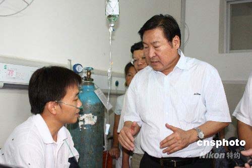 7月24日,廣西田東縣那讀煤礦透水事故已經過去3天,國家煤礦安監局局長趙鐵錘(右)到醫院看望獲救礦工韋明輝,了解當時事故發生情況。中新社發 曾德軍 攝