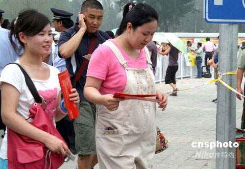 最后一批北京奧運門票于25日正式開始銷售,大批市民前來搶購門票。圖為一位孕婦在家人的陪同下不畏酷暑也來購買奧運門票。中新社發 葉林 攝