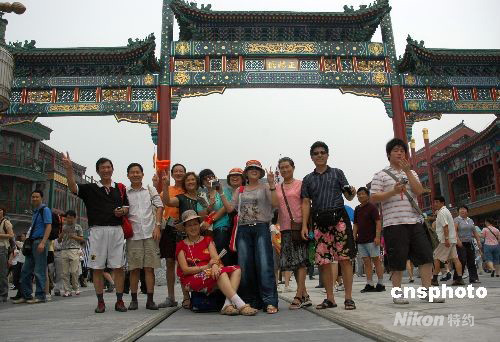 8月7日,北京前門大街在經歷一年多時間的保護、修繕后正式開街。現有12家商戶開張營業,預計奧運會之后將全面開市。開街后,前門大街將實行24小時全時段全覆蓋精細化城管執法模式。當日眾多游人前來參觀前門大街。中新社發 張雙雙 攝