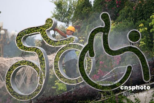 2008年8月27日,工作人員在天安門廣場布置殘奧會景觀,更換新鮮花卉。為迎接即將于9月6日開幕的北京殘奧會,天安門廣場北京殘奧會景觀布置工作正在加緊進行中。中新社發(fā) 魯谷 攝