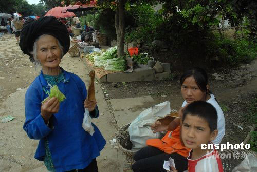 8月31日是四川攀西地震發(fā)生后的第二天,也是地震災(zāi)區(qū)當(dāng)?shù)剜l(xiāng)鎮(zhèn)趕集的日子。在距離震中約四十公里的地震災(zāi)區(qū)大龍?zhí)多l(xiāng)村民照常趕集,購買日常用品。圖為當(dāng)?shù)匕耸啐g的李姓老人帶著孫子、孫女到集市吃小吃。中新社發(fā) 保旭 攝