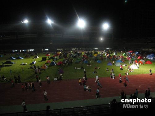九月一日晚,上千名攀枝花市民在攀枝花體育場搭帳篷過夜。因害怕再次發生余震,許多市民從家里搬到了體育場內。體育場已免費向市民開放,并二十四小時提供熱水。中新社發 劉子倩 攝
