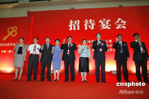 九月八日晚,國務院僑辦在廈門設宴款待出席“2008海外華商中國投資推介會”高端訪談及“改革開放三十年僑資企業成就展”的嘉賓,國務院僑辦、福建省僑辦及廈門市僑辦領導上臺感謝僑商僑資為祖國經濟建設付出的努力。中新社發 王麗南 攝