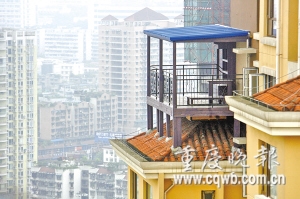 32樓的高空竟搭建起一個近20平米的陽臺(如圖)。除了驚嘆,網友們戲稱之為“重慶最牛陽臺”、“重慶第九奇跡建筑”。