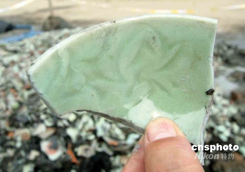 9月下旬,記者來到河下古鎮城河水道開挖工地現場,看到大量同種青瓷碎片裸露在距地表3米多深的河底,有一些已被挖掘機抓到地面臨時隔離起來。區有關部門已著手制訂考古方案,并對發掘現場落實了有效的保護措施。中新社發 李正林 攝