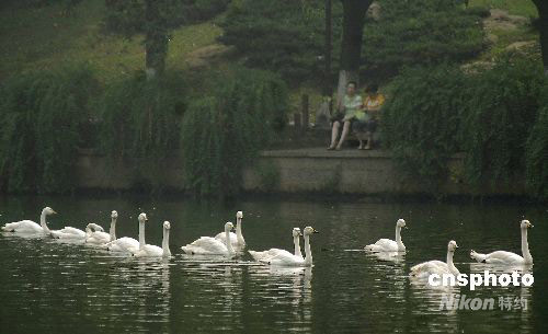 9月23日,天鵝在西湖湖面暢游。當日,28只天鵝在闊別西湖3年后重返西湖。據了解,2005年秋天,有關部門在西湖孤山處放養了80只白天鵝,為西湖增添了一道風景。但后來因為個別地方出現禽流感,有關部門就把白天鵝圈養了起來。中新社發 引煒 攝