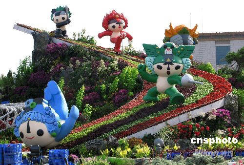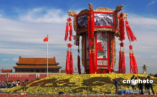 9月25日,北京天安門廣場“普天同慶”繁花錦簇的十一國慶花壇布置工程進(jìn)入了最后收尾階段。廣場東側(cè)的5個福娃花壇與中央9.9米高的民族傳統(tǒng)宮燈花壇相映成趣。中新社發(fā) 鄒憲 攝